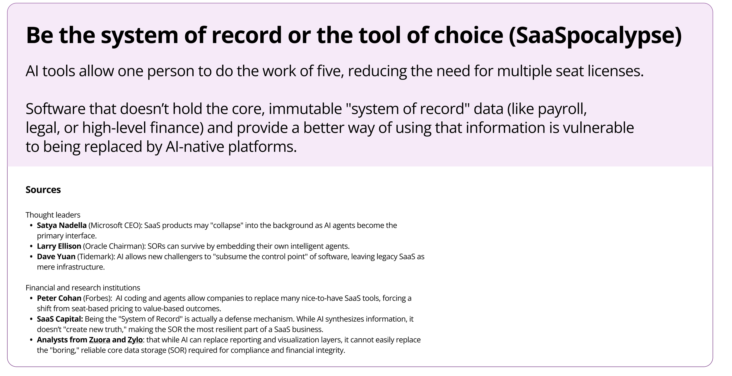 Multiple thought leaders warn that customers may use AI to replace multiple seats and perform tasks normally performed in an app’s UI. This reduces a SaaS provider to becoming just a system of record (SOR) instead of a solution provider.