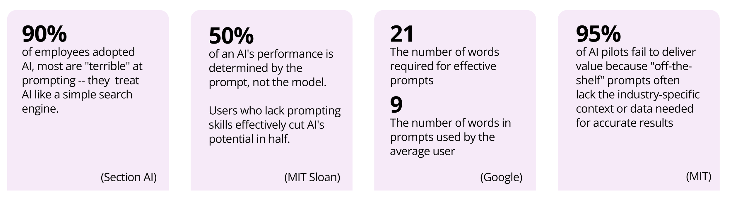 Research from Nielsen Norman Group and others consistently show that users struggle to formulate effective AI prompts — particularly for complex or unfamiliar tasks. When users can't ask well, AI systems underdeliver, and trust erodes fast. (NN/Group)